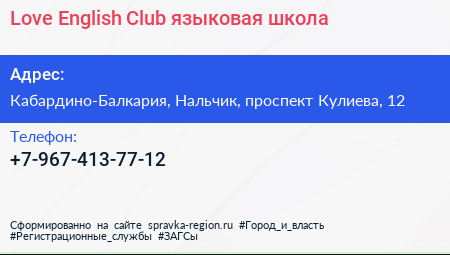 Love English Club, языковая школа по адресу Кабардино-Балкария, Нальчик, проспект Кулиева, 12 в дальнейшем Организация, размещена в следующих категориях: