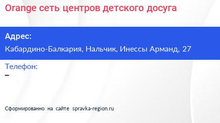 Orange, сеть центров детского досуга по адресу Кабардино-Балкария, Нальчик, Инессы Арманд, 27 в дальнейшем Организация, размещена в следующих категориях: