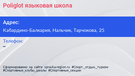 Poliglot, языковая школа по адресу Кабардино-Балкария, Нальчик, Тарчокова, 25 в дальнейшем Организация, размещена в следующих категориях: