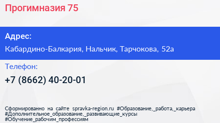 Прогимназия №75 по адресу Кабардино-Балкария, Нальчик, Тарчокова, 52а в дальнейшем Организация, размещена в следующих категориях: