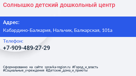 Солнышко, детский дошкольный центр по адресу Кабардино-Балкария, Нальчик, Балкарская, 101а в дальнейшем Организация, размещена в следующих категориях: