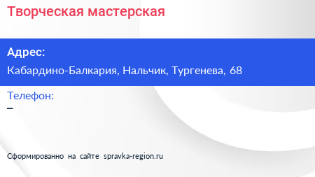 Творческая мастерская по адресу Кабардино-Балкария, Нальчик, Тургенева, 68 в дальнейшем Организация, размещена в следующих категориях: