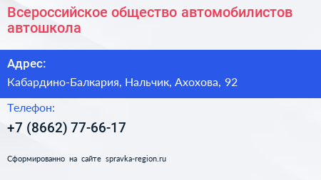 Всероссийское общество автомобилистов, автошкола по адресу Кабардино-Балкария, Нальчик, Ахохова, 92 в дальнейшем Организация, размещена в следующих категориях: