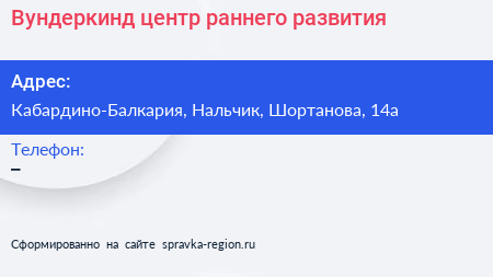 Вундеркинд, центр раннего развития по адресу Кабардино-Балкария, Нальчик, Шортанова, 14а в дальнейшем Организация, размещена в следующих категориях:
