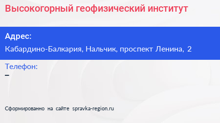 Высокогорный геофизический институт по адресу Кабардино-Балкария, Нальчик, проспект Ленина, 2 в дальнейшем Организация, размещена в следующих категориях: