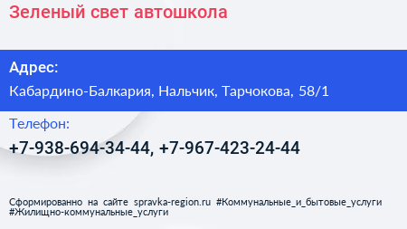 Зеленый свет, автошкола по адресу Кабардино-Балкария, Нальчик, Тарчокова, 58/1 в дальнейшем Организация, размещена в следующих категориях:
