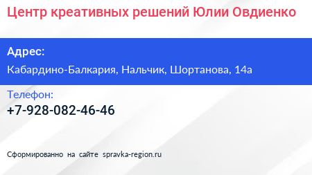 Центр креативных решений Юлии Овдиенко по адресу Кабардино-Балкария, Нальчик, Шортанова, 14а в дальнейшем Организация, размещена в следующих категориях: