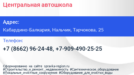 Центральная, автошкола по адресу Кабардино-Балкария, Нальчик, Тарчокова, 25 в дальнейшем Организация, размещена в следующих категориях: