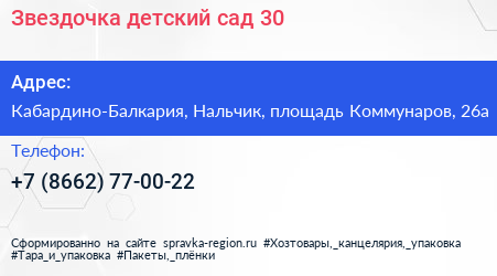Звездочка, детский сад №30 по адресу Кабардино-Балкария, Нальчик, площадь Коммунаров, 26а в дальнейшем Организация, размещена в следующих категориях: