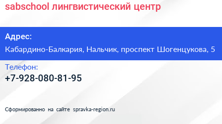 sabschool, лингвистический центр по адресу Кабардино-Балкария, Нальчик, проспект Шогенцукова, 5 в дальнейшем Организация, размещена в следующих категориях: