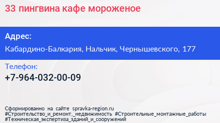 33 пингвина, кафе-мороженое по адресу Кабардино-Балкария, Нальчик, Чернышевского, 177 в дальнейшем Организация, размещена в следующих категориях: