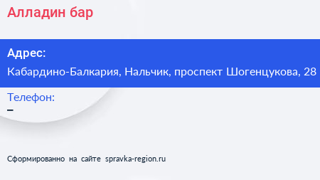 Алладин, бар по адресу Кабардино-Балкария, Нальчик, проспект Шогенцукова, 28 в дальнейшем Организация, размещена в следующих категориях: