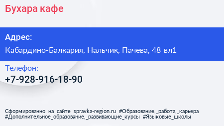 Бухара, кафе по адресу Кабардино-Балкария, Нальчик, Пачева, 48 вл1 в дальнейшем Организация, размещена в следующих категориях: