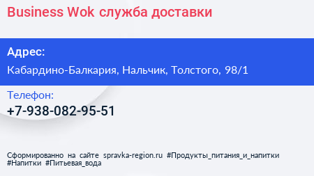 Business Wok, служба доставки по адресу Кабардино-Балкария, Нальчик, Толстого, 98/1 в дальнейшем Организация, размещена в следующих категориях:
