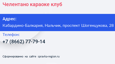 Челентано, караоке-клуб по адресу Кабардино-Балкария, Нальчик, проспект Шогенцукова, 28 в дальнейшем Организация, размещена в следующих категориях: