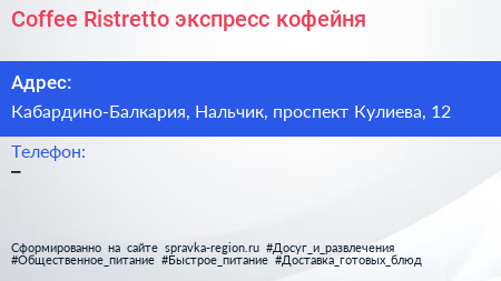 Coffee Ristretto, экспресс-кофейня по адресу Кабардино-Балкария, Нальчик, проспект Кулиева, 12 в дальнейшем Организация, размещена в следующих категориях: