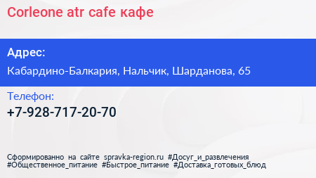 Corleone atr-cafe, кафе по адресу Кабардино-Балкария, Нальчик, Шарданова, 65 в дальнейшем Организация, размещена в следующих категориях: