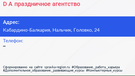 D & A, праздничное агентство по адресу Кабардино-Балкария, Нальчик, Головко, 24 в дальнейшем Организация, размещена в следующих категориях: