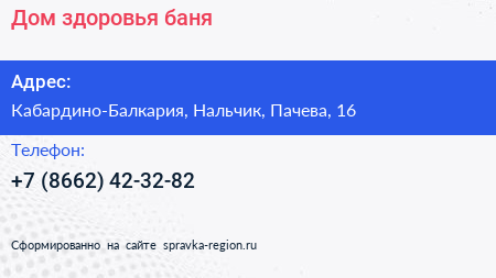 Дом здоровья, баня по адресу Кабардино-Балкария, Нальчик, Пачева, 16 в дальнейшем Организация, размещена в следующих категориях: