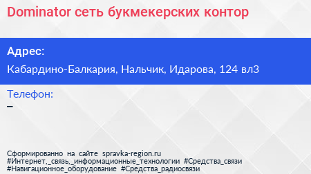 Dominator, сеть букмекерских контор по адресу Кабардино-Балкария, Нальчик, Идарова, 124 вл3 в дальнейшем Организация, размещена в следующих категориях: