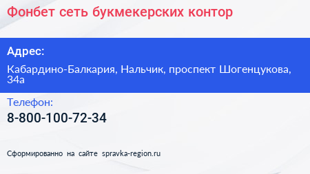 Фонбет, сеть букмекерских контор по адресу Кабардино-Балкария, Нальчик, проспект Шогенцукова, 34а в дальнейшем Организация, размещена в следующих категориях:
