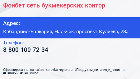 Фонбет, сеть букмекерских контор по адресу Кабардино-Балкария, Нальчик, проспект Кулиева, 28а в дальнейшем Организация, размещена в следующих категориях: