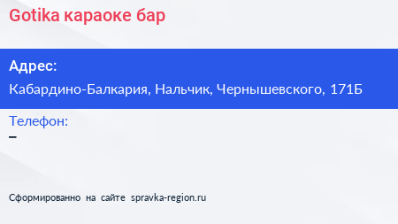 Gotika, караоке-бар по адресу Кабардино-Балкария, Нальчик, Чернышевского, 171Б в дальнейшем Организация, размещена в следующих категориях: