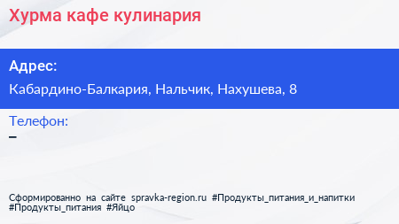 Хурма, кафе-кулинария по адресу Кабардино-Балкария, Нальчик, Нахушева, 8 в дальнейшем Организация, размещена в следующих категориях: