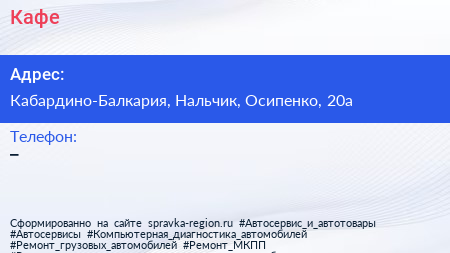 Кафе по адресу Кабардино-Балкария, Нальчик, Осипенко, 20а в дальнейшем Организация, размещена в следующих категориях: