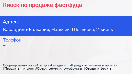 Киоск по продаже фастфуда по адресу Кабардино-Балкария, Нальчик, Шогенова, 2 киоск в дальнейшем Организация, размещена в следующих категориях: