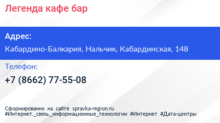 Легенда, кафе-бар по адресу Кабардино-Балкария, Нальчик, Кабардинская, 148 в дальнейшем Организация, размещена в следующих категориях: