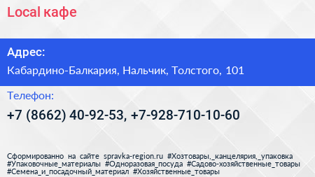 Local, кафе по адресу Кабардино-Балкария, Нальчик, Толстого, 101 в дальнейшем Организация, размещена в следующих категориях: