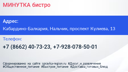 МИНУТКА, бистро по адресу Кабардино-Балкария, Нальчик, проспект Кулиева, 13 в дальнейшем Организация, размещена в следующих категориях: