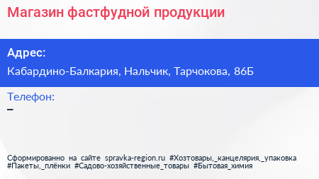 Магазин фастфудной продукции по адресу Кабардино-Балкария, Нальчик, Тарчокова, 86Б в дальнейшем Организация, размещена в следующих категориях: