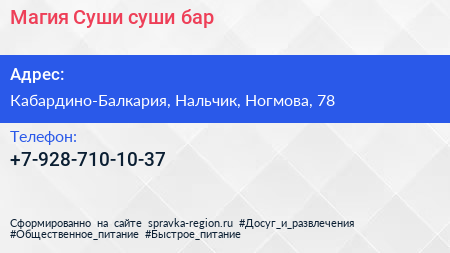 Магия Суши, суши-бар по адресу Кабардино-Балкария, Нальчик, Ногмова, 78 в дальнейшем Организация, размещена в следующих категориях: