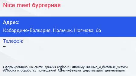 Nice meet, бургерная по адресу Кабардино-Балкария, Нальчик, Ногмова, 6а в дальнейшем Организация, размещена в следующих категориях: