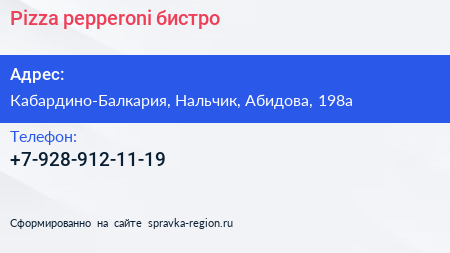 Pizza pepperoni, бистро по адресу Кабардино-Балкария, Нальчик, Абидова, 198а в дальнейшем Организация, размещена в следующих категориях: