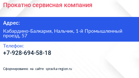 Прокатно-сервисная компания по адресу Кабардино-Балкария, Нальчик, 1-й Промышленный проезд, 57 в дальнейшем Организация, размещена в следующих категориях: