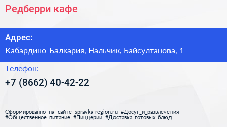 Редберри, кафе по адресу Кабардино-Балкария, Нальчик, Байсултанова, 1 в дальнейшем Организация, размещена в следующих категориях: