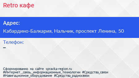 Retro, кафе по адресу Кабардино-Балкария, Нальчик, проспект Ленина, 50 в дальнейшем Организация, размещена в следующих категориях: