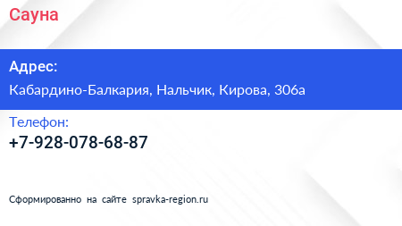 Сауна по адресу Кабардино-Балкария, Нальчик, Кирова, 306а в дальнейшем Организация, размещена в следующих категориях: