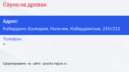 Сауна на дровах по адресу Кабардино-Балкария, Нальчик, Кабардинская, 210/212 в дальнейшем Организация, размещена в следующих категориях: