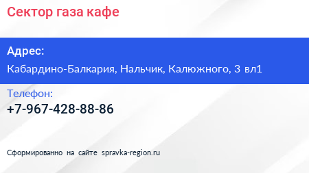 Сектор газа, кафе по адресу Кабардино-Балкария, Нальчик, Калюжного, 3 вл1 в дальнейшем Организация, размещена в следующих категориях: