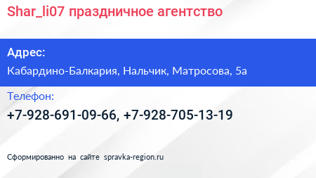 Shar_li07, праздничное агентство по адресу Кабардино-Балкария, Нальчик, Матросова, 5а в дальнейшем Организация, размещена в следующих категориях: