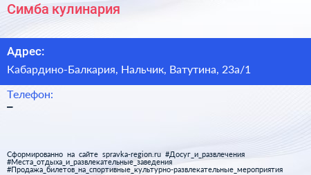 Симба, кулинария по адресу Кабардино-Балкария, Нальчик, Ватутина, 23а/1 в дальнейшем Организация, размещена в следующих категориях: