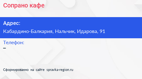 Сопрано, кафе по адресу Кабардино-Балкария, Нальчик, Идарова, 91 в дальнейшем Организация, размещена в следующих категориях: