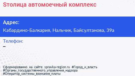 Sтолица, автомоечный комплекс по адресу Кабардино-Балкария, Нальчик, Байсултанова, 39а в дальнейшем Организация, размещена в следующих категориях:
