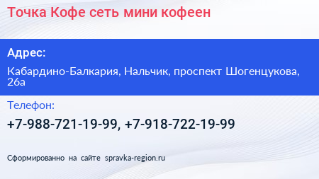 Точка Кофе, сеть мини-кофеен по адресу Кабардино-Балкария, Нальчик, проспект Шогенцукова, 26а в дальнейшем Организация, размещена в следующих категориях: