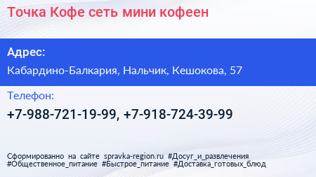 Точка Кофе, сеть мини-кофеен по адресу Кабардино-Балкария, Нальчик, Кешокова, 57 в дальнейшем Организация, размещена в следующих категориях: