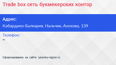 Trade box, сеть букмекерских контор по адресу Кабардино-Балкария, Нальчик, Ахохова, 139 в дальнейшем Организация, размещена в следующих категориях: